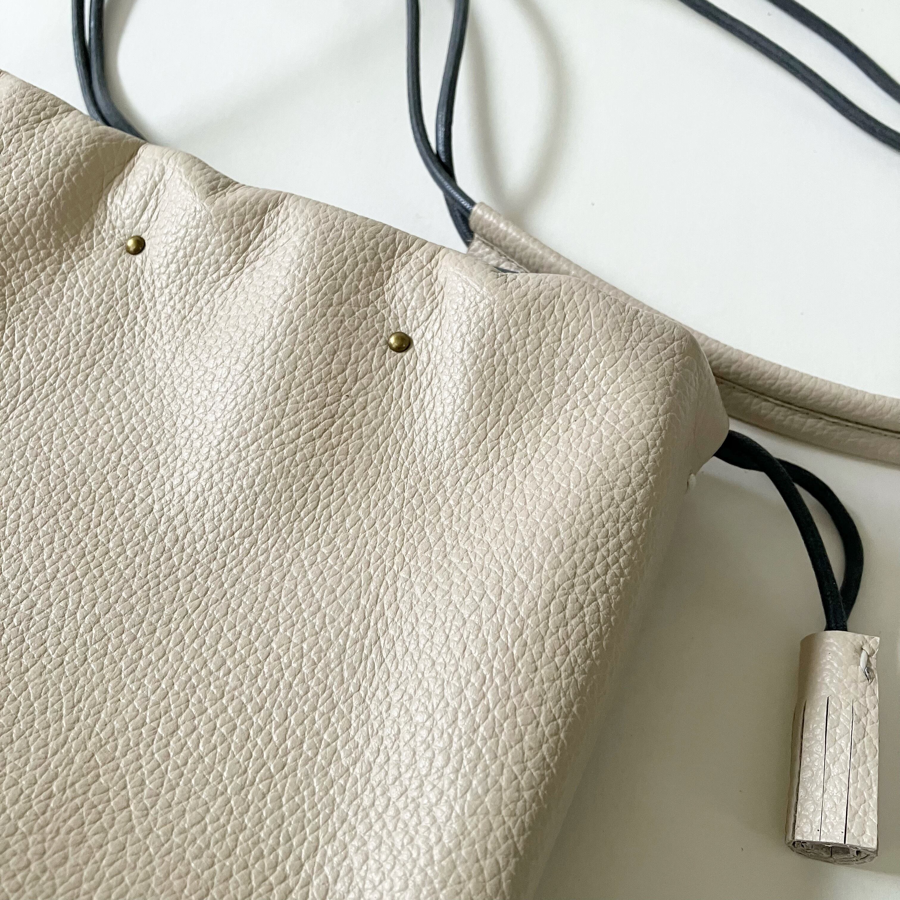 ショルダー部分はロウビキコード紐のグレー色を使用し、肩掛け部分のレザーをつけています。バッグ内側のハトメにショルダー紐を通しているので、結び目でショルダーの長さ調節が出来ます。スタイルにフィットするデザインで、日常使いから特別な場面まで活躍します。