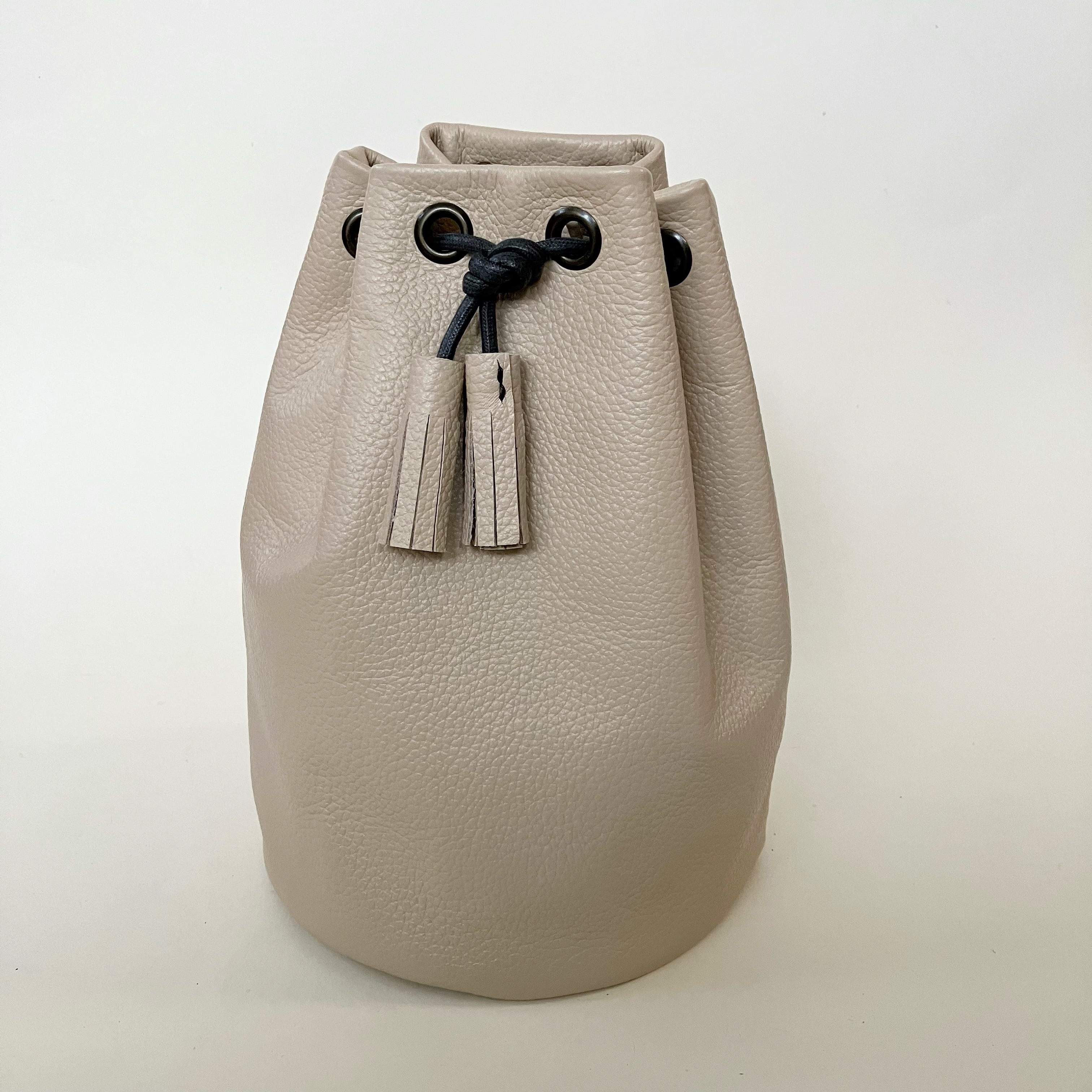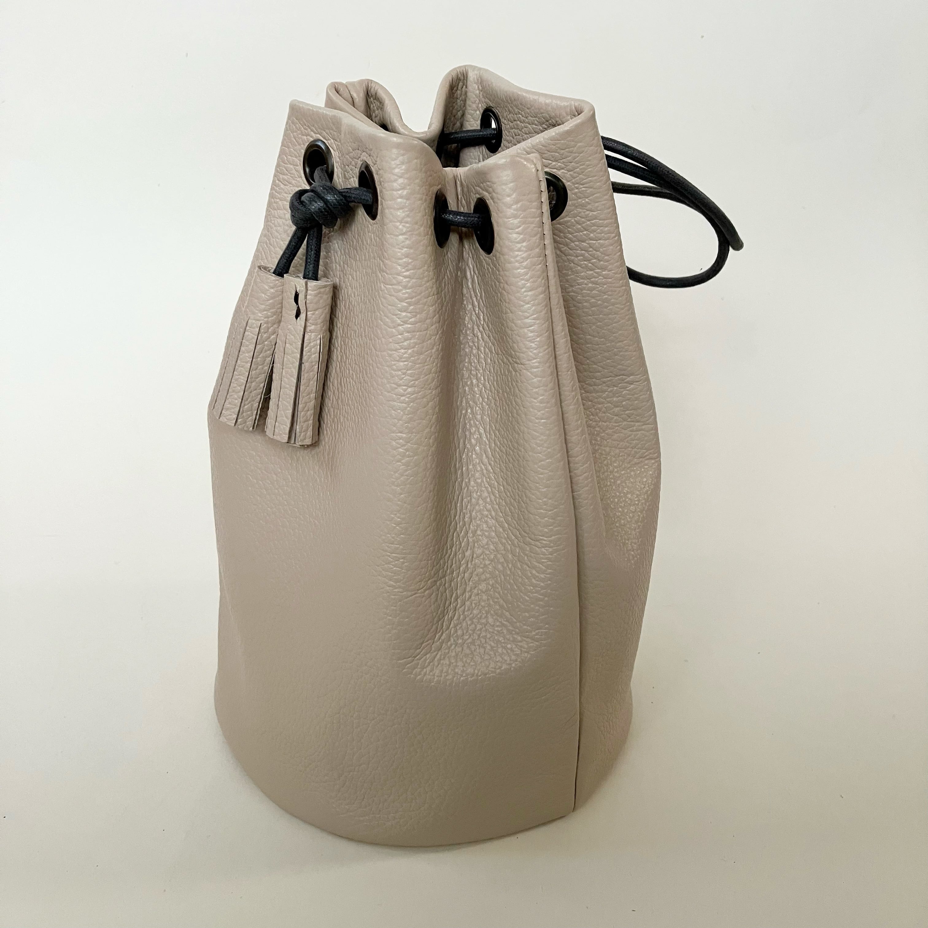 持ち手にはロウビキコード紐の濃いグレーを採用しており、肩掛けや手提げの2通りのスタイルを楽しむことができます。持ち手の結び目で長さ調節も可能ですので、自由にアレンジできます。肩掛けにする際は取り外し可能なパーツを付けています。日常使いから特別な場面まで多様に使えるおしゃれなデザインです。