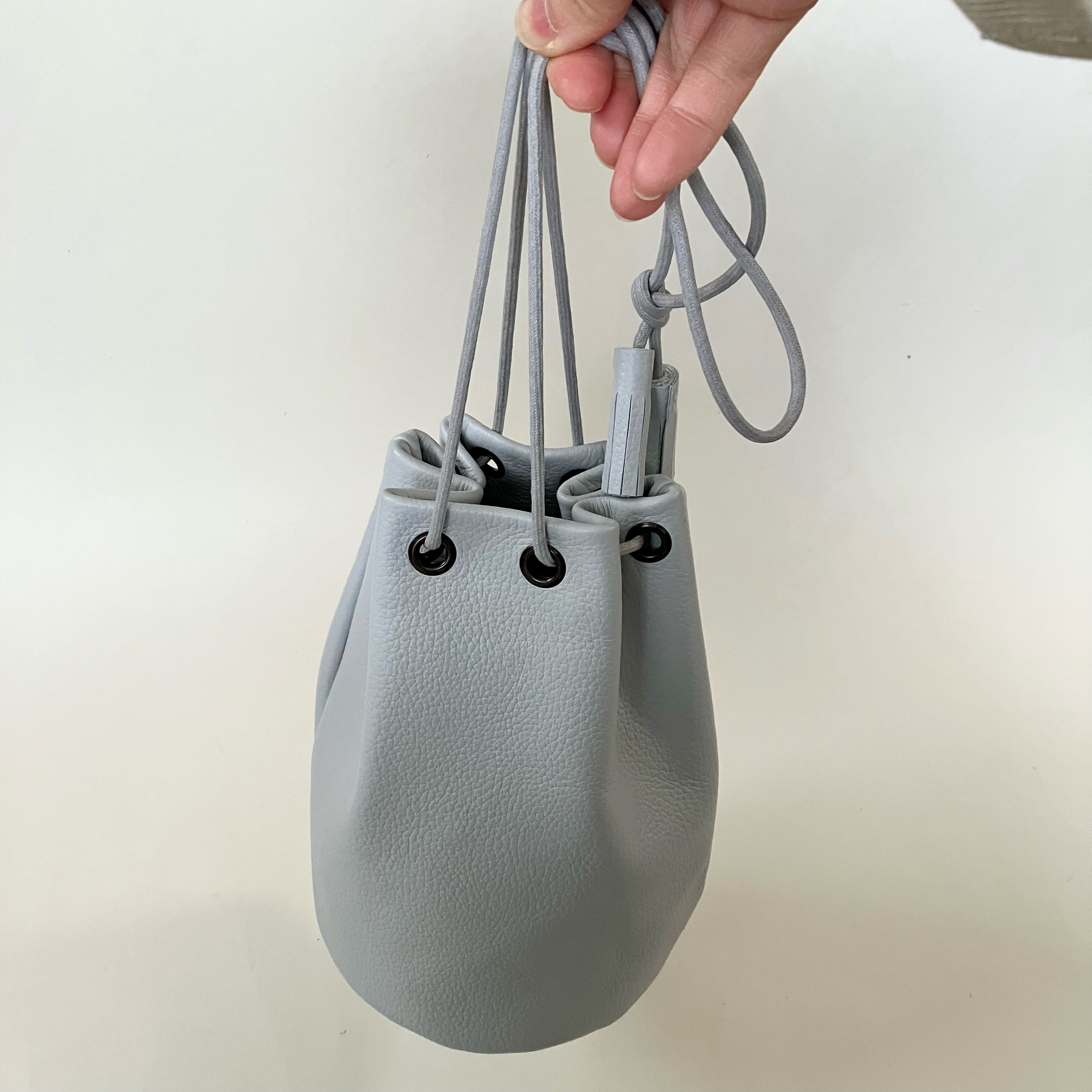 上質な牛革を使用したこの巾着バッグは、シボ感がありつつも張りのある風合いが特徴です。アイスグレーの色合いは、冷静で落ち着いた印象を与え、カジュアルから洗練されたシーンまで幅広く活用いただけます。